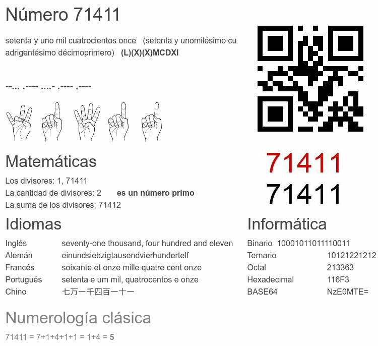Si conoce algo interesante sobre el número 71411 o cualquier número natural (entero positivo), por favor escríbanos.Número 71 411 en otras unidades