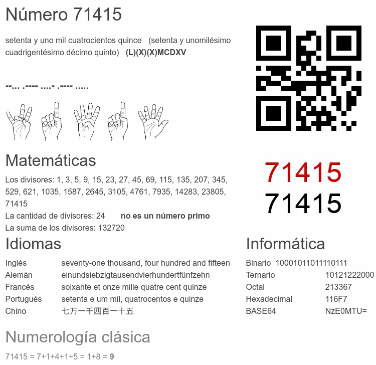 Si conoce algo interesante sobre el número 71415 o cualquier número natural (entero positivo), por favor escríbanos.Número 71 415 en otras unidades
