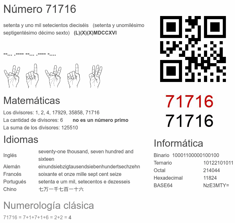 Si conoce algo interesante sobre el número 71716 o cualquier número natural (entero positivo), por favor escríbanos.Número 71 716 en otras unidades