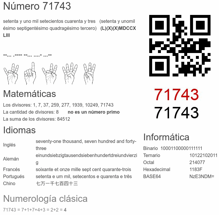 Si conoce algo interesante sobre el número 71743 o cualquier número natural (entero positivo), por favor escríbanos.Número 71 743 en otras unidades