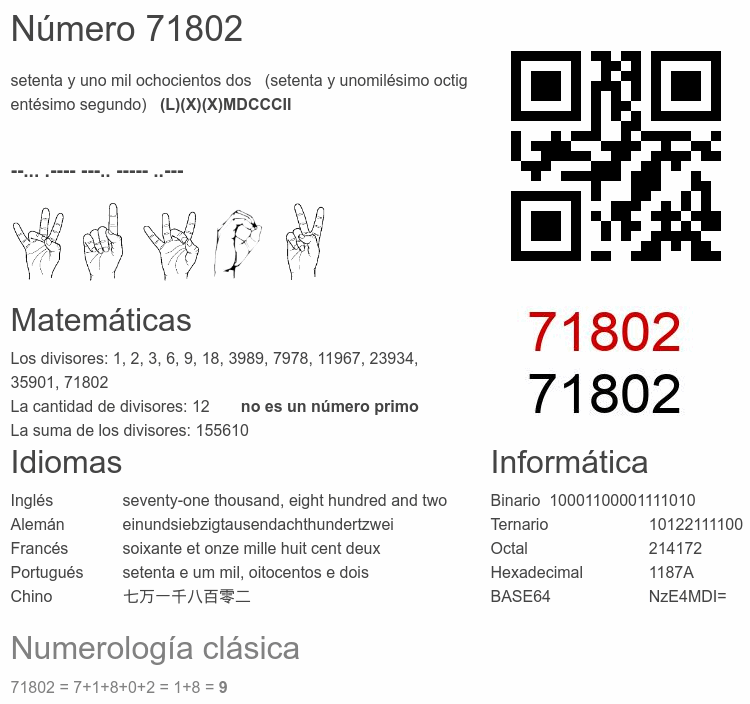 Si conoce algo interesante sobre el número 71802 o cualquier número natural (entero positivo), por favor escríbanos.Número 71 802 en otras unidades