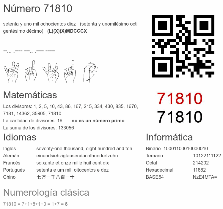 Si conoce algo interesante sobre el número 71810 o cualquier número natural (entero positivo), por favor escríbanos.Número 71 810 en otras unidades