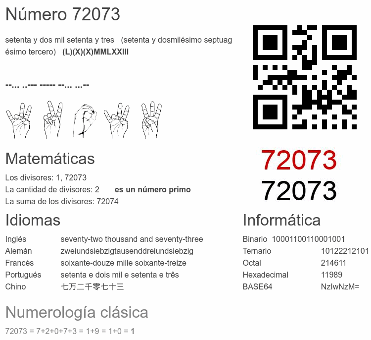 Si conoce algo interesante sobre el número 72073 o cualquier número natural (entero positivo), por favor escríbanos.Número 72 073 en otras unidades