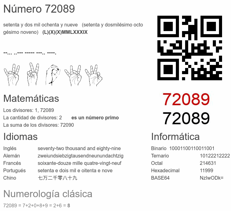 Si conoce algo interesante sobre el número 72089 o cualquier número natural (entero positivo), por favor escríbanos.Número 72 089 en otras unidades