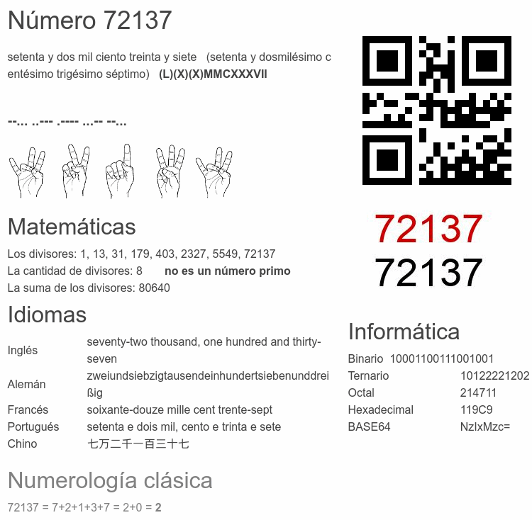 Si conoce algo interesante sobre el número 72137 o cualquier número natural (entero positivo), por favor escríbanos.Número 72 137 en otras unidades