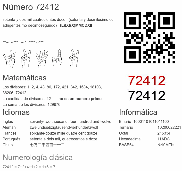 | Portugués: | 🔊 (número 72 412) | setenta e dois mil, quatrocentos e doze |