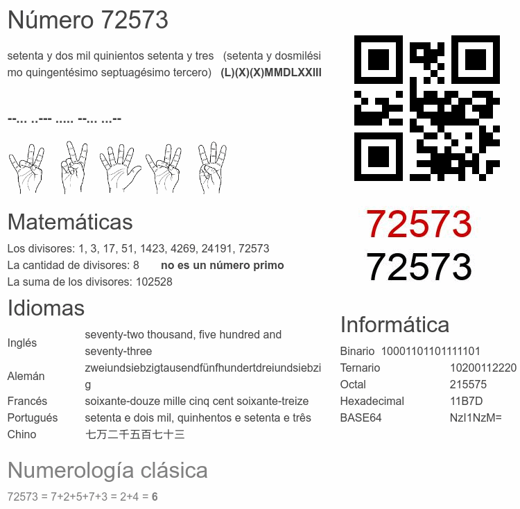 Si conoce algo interesante sobre el número 72573 o cualquier número natural (entero positivo), por favor escríbanos.Número 72 573 en otras unidades