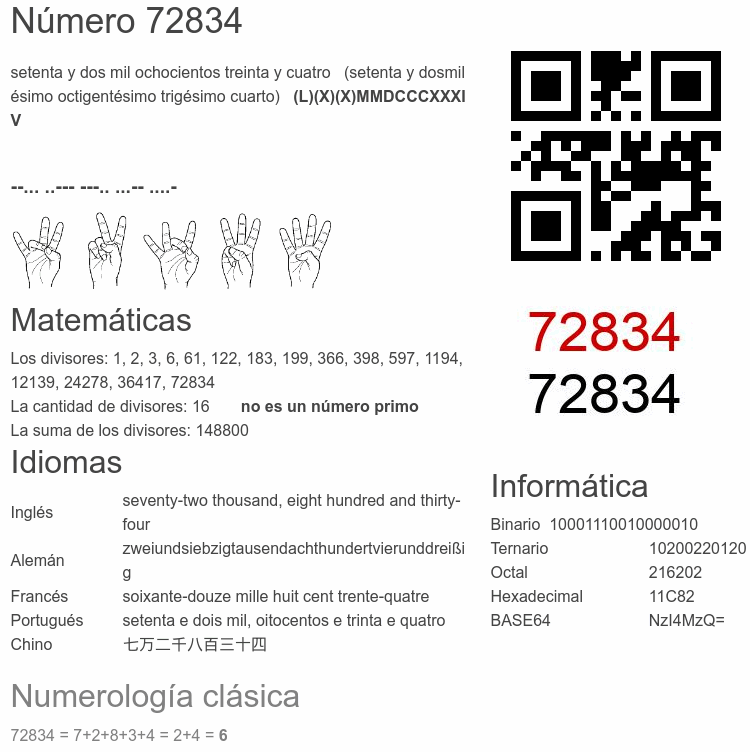 Si conoce algo interesante sobre el número 72834 o cualquier número natural (entero positivo), por favor escríbanos.Número 72 834 en otras unidades