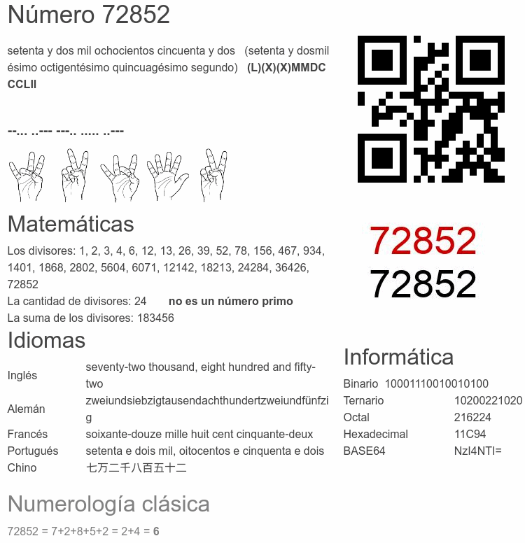 Curiosidades del número 72852