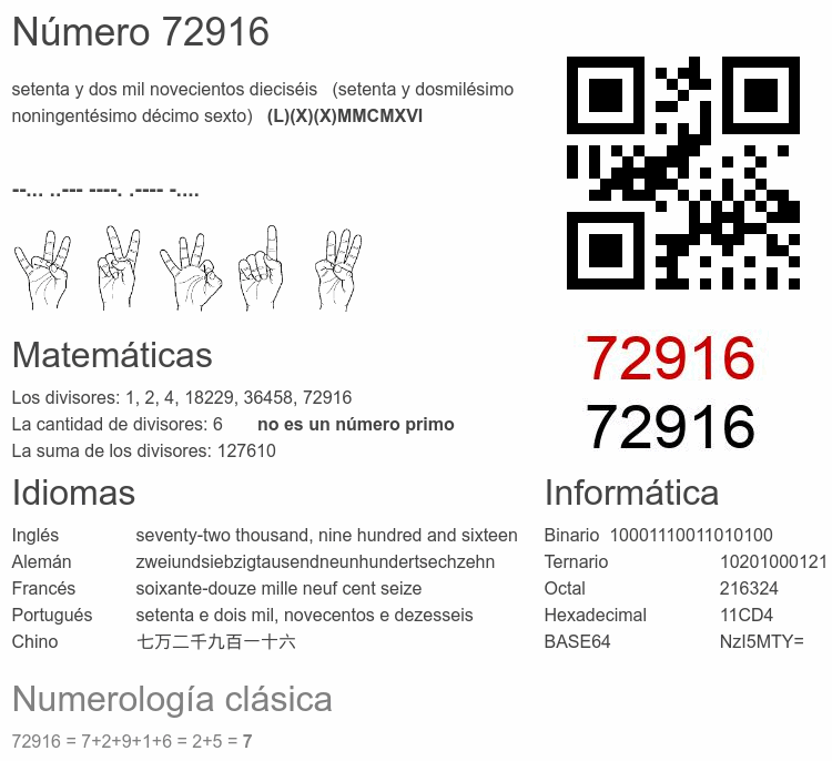 Si conoce algo interesante sobre el número 72916 o cualquier número natural (entero positivo), por favor escríbanos.Número 72 916 en otras unidades