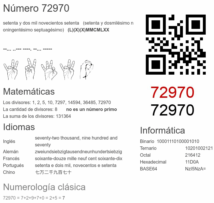 Si conoce algo interesante sobre el número 72970 o cualquier número natural (entero positivo), por favor escríbanos.Número 72 970 en otras unidades
