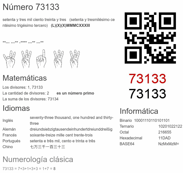 | Portugués: | 🔊 (número 73 133) | setenta e três mil, cento e trinta e três |