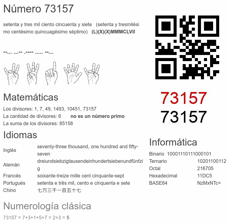Si conoce algo interesante sobre el número 73157 o cualquier número natural (entero positivo), por favor escríbanos.Número 73 157 en otras unidades