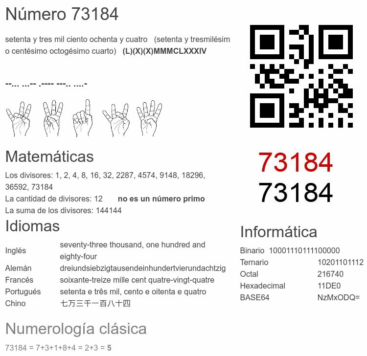 Si conoce algo interesante sobre el número 73184 o cualquier número natural (entero positivo), por favor escríbanos.Número 73 184 en otras unidades