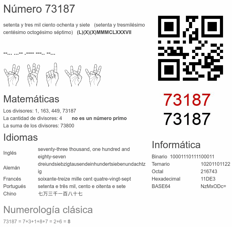 Si conoce algo interesante sobre el número 73187 o cualquier número natural (entero positivo), por favor escríbanos.Número 73 187 en otras unidades