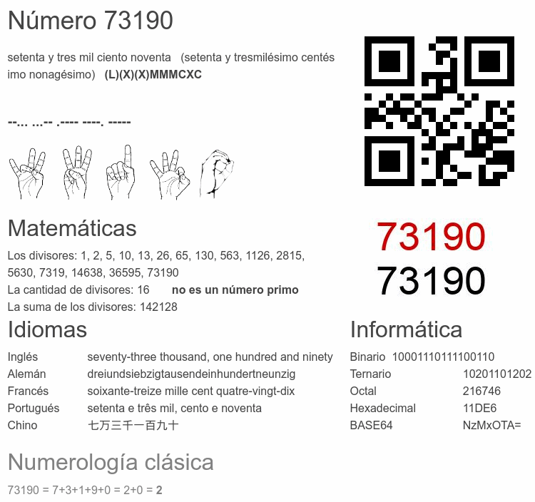 Si conoce algo interesante sobre el número 73190 o cualquier número natural (entero positivo), por favor escríbanos.Número 73 190 en otras unidades