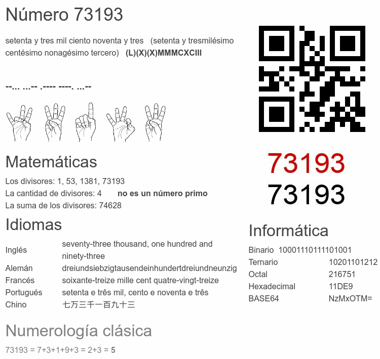 Si conoce algo interesante sobre el número 73193 o cualquier número natural (entero positivo), por favor escríbanos.Número 73 193 en otras unidades