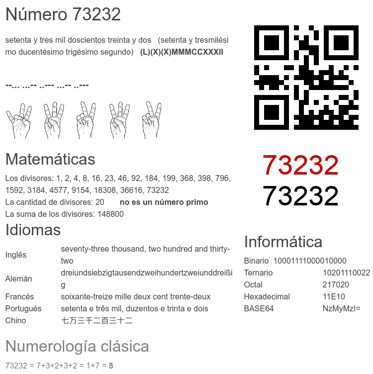 Si conoce algo interesante sobre el número 73232 o cualquier número natural (entero positivo), por favor escríbanos.Número 73 232 en otras unidades
