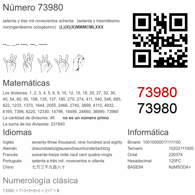 Si conoce algo interesante sobre el número 73980 o cualquier número natural (entero positivo), por favor escríbanos.Número 73 980 en otras unidades