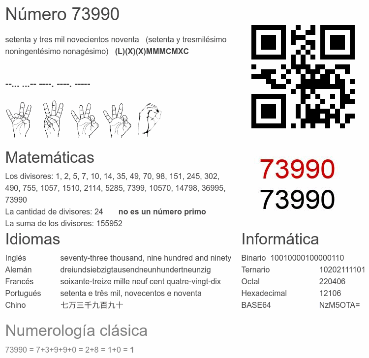 Si conoce algo interesante sobre el número 73990 o cualquier número natural (entero positivo), por favor escríbanos.Número 73 990 en otras unidades