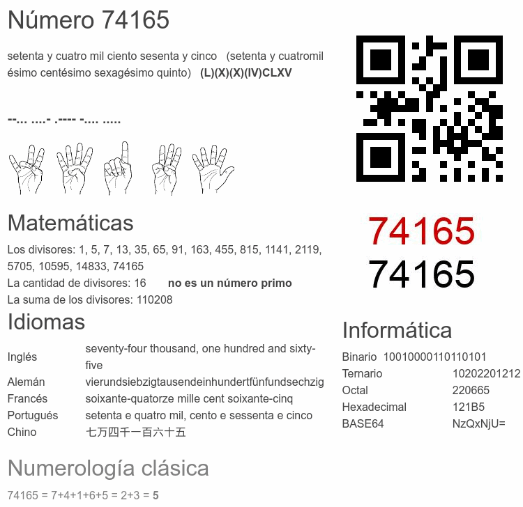 Si conoce algo interesante sobre el número 74165 o cualquier número natural (entero positivo), por favor escríbanos.Número 74 165 en otras unidades