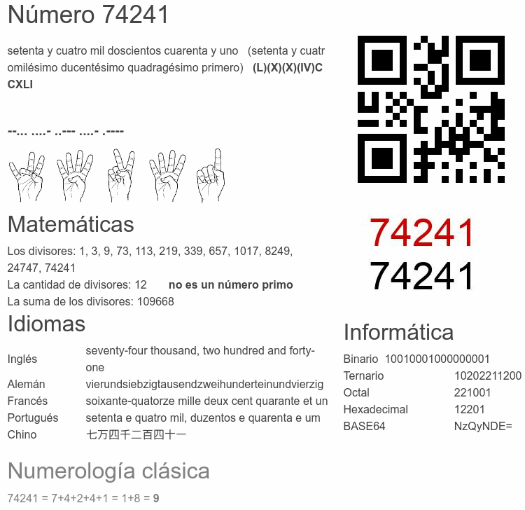 Si conoce algo interesante sobre el número 74241 o cualquier número natural (entero positivo), por favor escríbanos.Número 74 241 en otras unidades