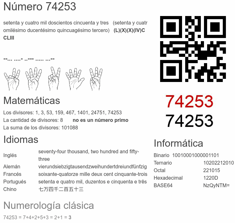 Si conoce algo interesante sobre el número 74253 o cualquier número natural (entero positivo), por favor escríbanos.Número 74 253 en otras unidades