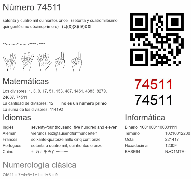 Si conoce algo interesante sobre el número 74511 o cualquier número natural (entero positivo), por favor escríbanos.Número 74 511 en otras unidades