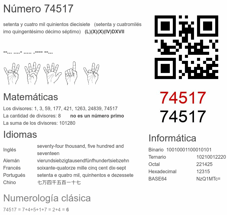 Si conoce algo interesante sobre el número 74517 o cualquier número natural (entero positivo), por favor escríbanos.Número 74 517 en otras unidades