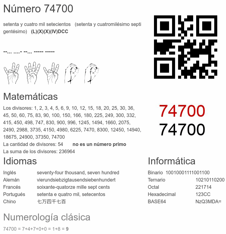 | Portugués: | 🔊 (número 74 700) | setenta e quatro mil, setecentos |