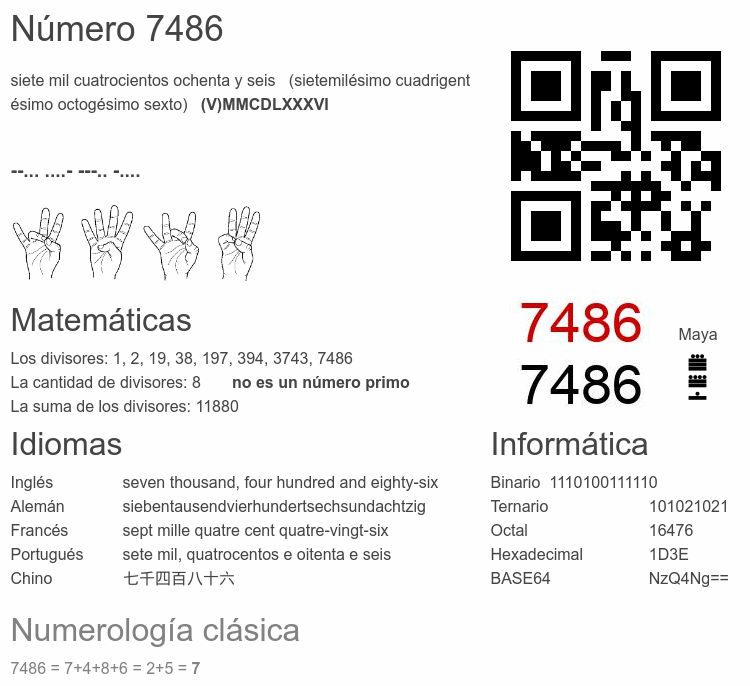 Si conoce algo interesante sobre el número 7486 o cualquier número natural (entero positivo), por favor escríbanos.Número 7 486 en otras unidades