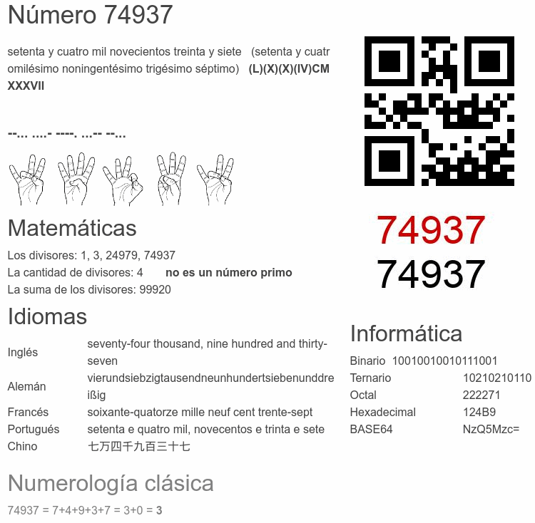 Si conoce algo interesante sobre el número 74937 o cualquier número natural (entero positivo), por favor escríbanos.Número 74 937 en otras unidades