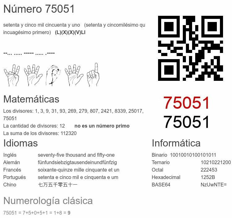Si conoce algo interesante sobre el número 75051 o cualquier número natural (entero positivo), por favor escríbanos.Número 75 051 en otras unidades