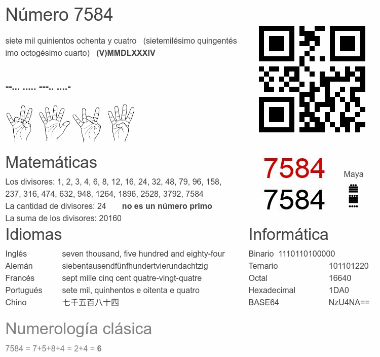 Si conoce algo interesante sobre el número 7584 o cualquier número natural (entero positivo), por favor escríbanos.Número 7 584 en otras unidades