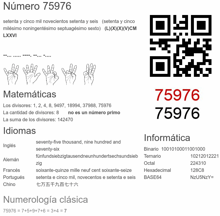 Si conoce algo interesante sobre el número 75976 o cualquier número natural (entero positivo), por favor escríbanos.Número 75 976 en otras unidades