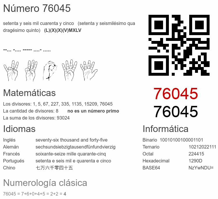 Si conoce algo interesante sobre el número 76045 o cualquier número natural (entero positivo), por favor escríbanos.Número 76 045 en otras unidades