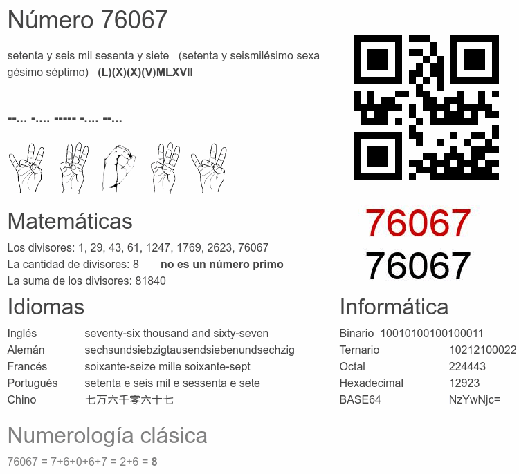 Si conoce algo interesante sobre el número 76067 o cualquier número natural (entero positivo), por favor escríbanos.Número 76 067 en otras unidades