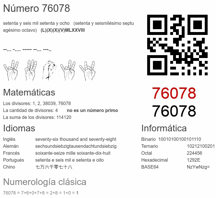 Si conoce algo interesante sobre el número 76078 o cualquier número natural (entero positivo), por favor escríbanos.Número 76 078 en otras unidades
