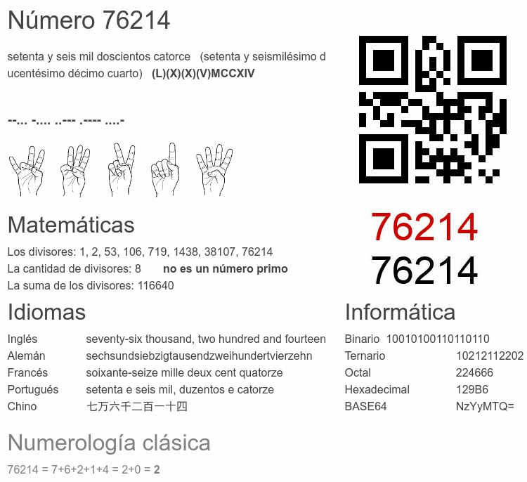 El número par 76 214 se dice 🔊, y se escribe con las palabras: setenta y seis mil doscientos catorce. El número ordinal 76214.° se dice 🔊 y se escribe como: setenta y seismilésimo ducentésimo décimo cuarto. El significado del número 76214 en Matemáticas: Es un primo? Factorización y árbol de factores primos. La raíz cuadrada de y la raíz cúbica de 76214. El significado en informática, numerología, códigos e imágenes, escritura y denominación en otras lenguas. Otras curiosidades relacionadas con el 76214.