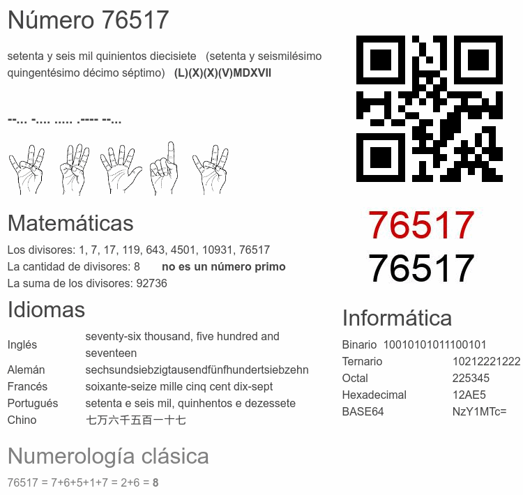 Si conoce algo interesante sobre el número 76517 o cualquier número natural (entero positivo), por favor escríbanos.Número 76 517 en otras unidades