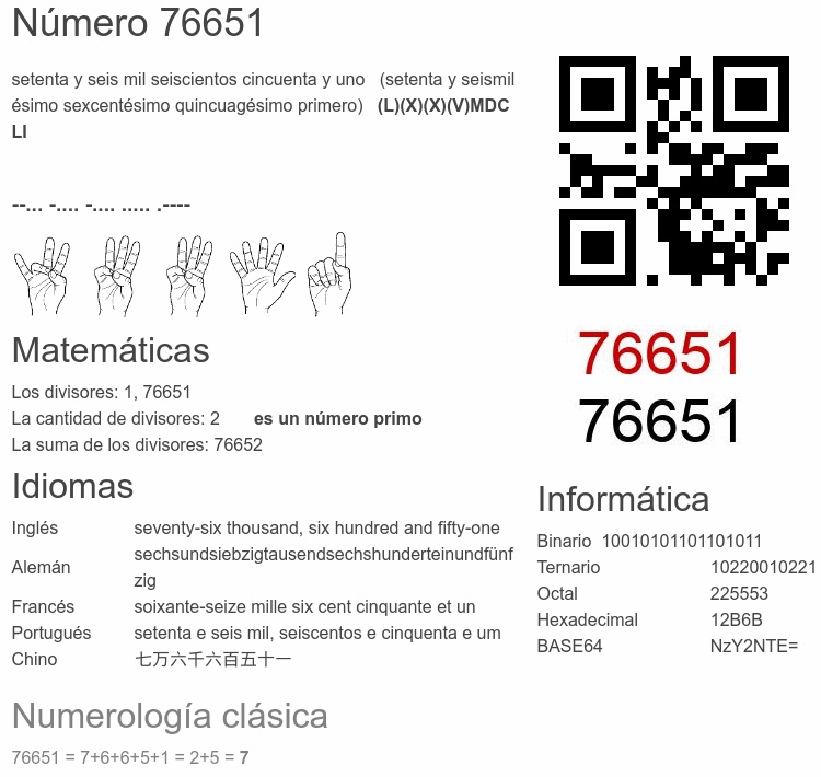 Si conoce algo interesante sobre el número 76651 o cualquier número natural (entero positivo), por favor escríbanos.Número 76 651 en otras unidades