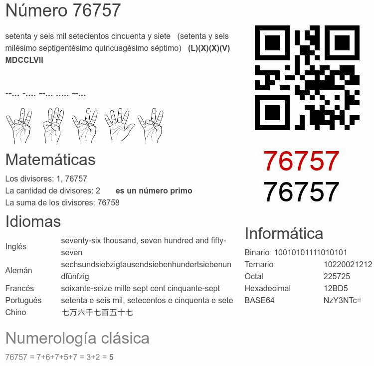 Si conoce algo interesante sobre el número 76757 o cualquier número natural (entero positivo), por favor escríbanos.Número 76 757 en otras unidades
