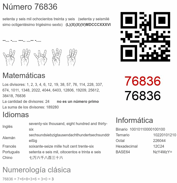 Si conoce algo interesante sobre el número 76836 o cualquier número natural (entero positivo), por favor escríbanos.Número 76 836 en otras unidades