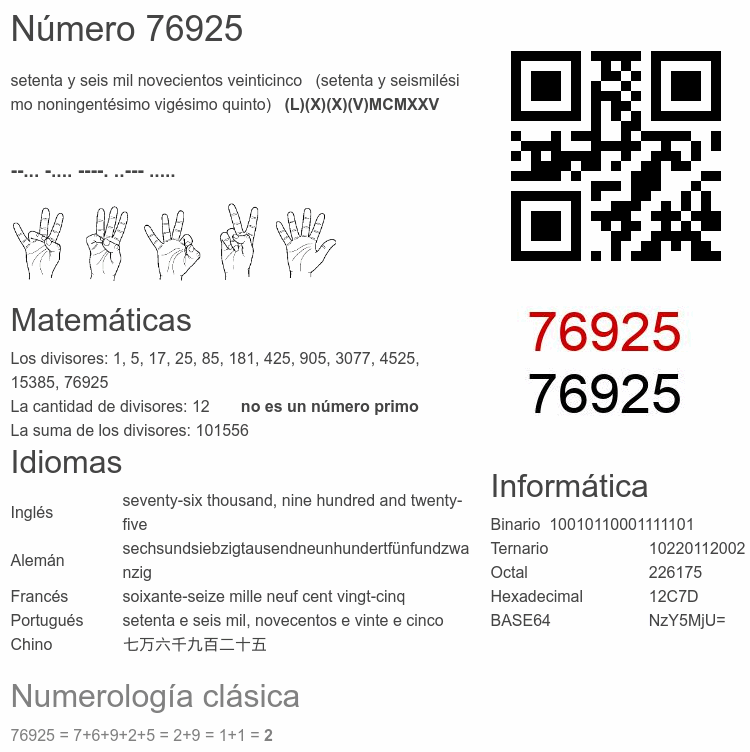 Si conoce algo interesante sobre el número 76925 o cualquier número natural (entero positivo), por favor escríbanos.Número 76 925 en otras unidades