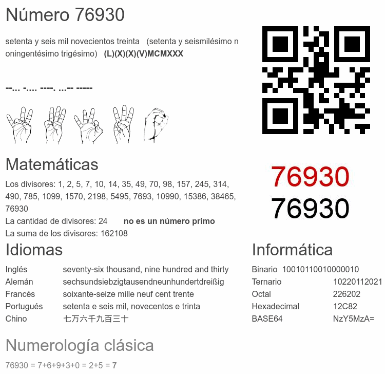 Si conoce algo interesante sobre el número 76930 o cualquier número natural (entero positivo), por favor escríbanos.Número 76 930 en otras unidades