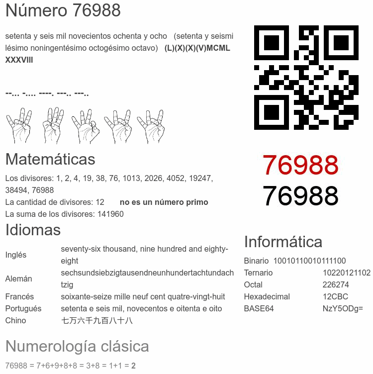 Si conoce algo interesante sobre el número 76988 o cualquier número natural (entero positivo), por favor escríbanos.Número 76 988 en otras unidades