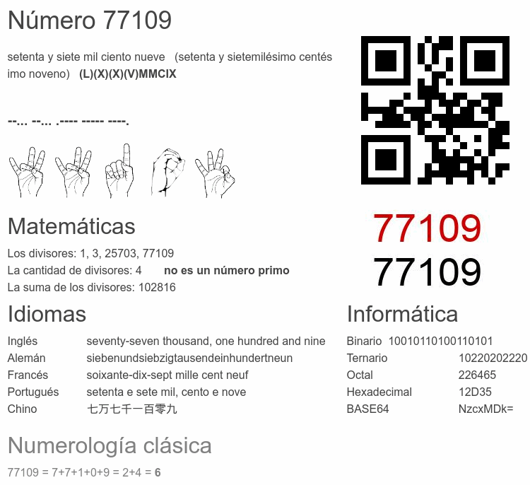 Si conoce algo interesante sobre el número 77109 o cualquier número natural (entero positivo), por favor escríbanos.Número 77 109 en otras unidades