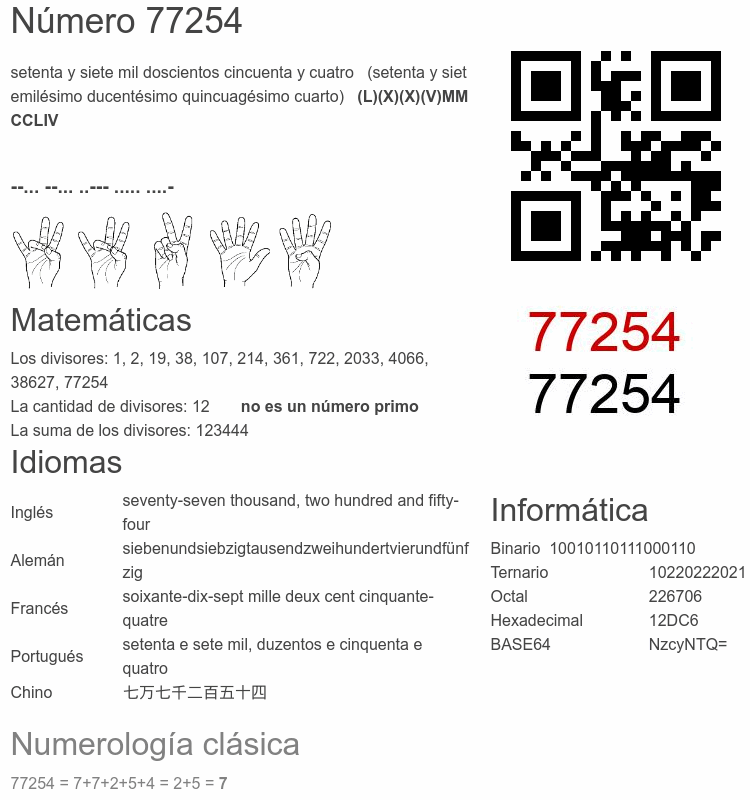 Si conoce algo interesante sobre el número 77254 o cualquier número natural (entero positivo), por favor escríbanos.Número 77 254 en otras unidades