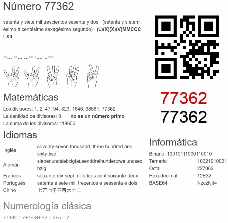 Si conoce algo interesante sobre el número 77362 o cualquier número natural (entero positivo), por favor escríbanos.Número 77 362 en otras unidades