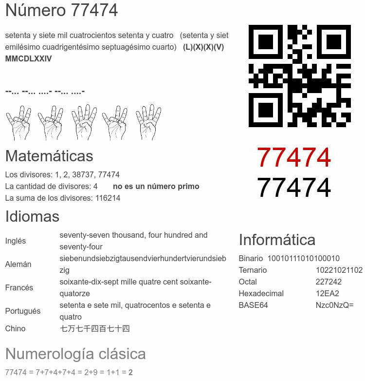 Si conoce algo interesante sobre el número 77474 o cualquier número natural (entero positivo), por favor escríbanos.Número 77 474 en otras unidades